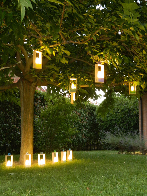 Le linee essenziali, il telaio in legno naturale e il vetro diffondono una luce morbida, creando giochi di riflessi delicati sia in ambienti indoor che outdoor.